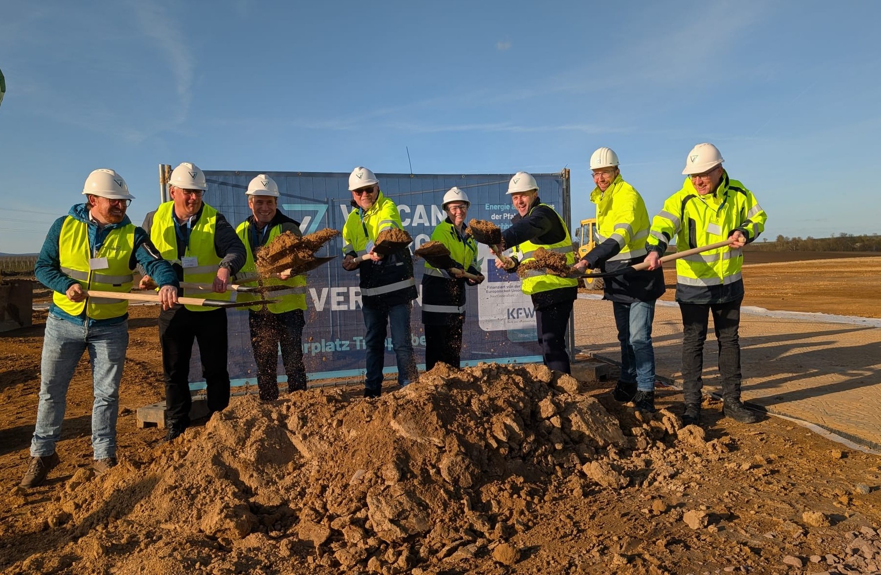 Cris Moreno, CEO Vulcan Energy, Dr. Dominik Geißler, Oberbürgermeister der Stadt Landau, Nicola Beer, Vizepräsidentin der Europäischen Investitionsbank, Petra Dick-Walther, Staatssekretärin im Ministerium für Wirtschaft, Verkehr, Landwirtschaft und Weinbau Rheinland-Pfalz, Dr. Horst Kreuter, Gründer von Vulcan, Felicity Gooding, Chief Financial Officer Vulcan Energy, Carsten Bachg, Geschäftsführer der Vulcan Energie Ressourcen GmbH und Andreas Tschauder, Direktor beim Landesamt für Geologie und Bergbau RLP beim offiziellen Spatenstich zur G-LEP. Copyright: Vulcan Energy/ Tobias Roth Fotograf